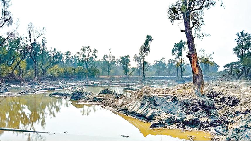 A gang has been mindlessly lifting earth from a reserve forest in Gangamati area adjacent to Kuakata sea beach in Kalapara upazila of Patuakhali.