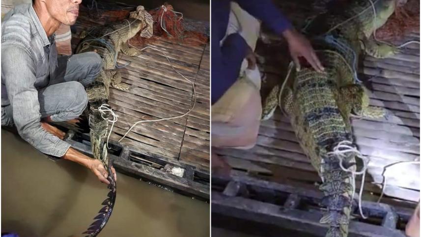 A crocodile was caught in the fishing net of a fisherman at Hardinge Bridge point of the Padma River in Bheramara upazila of Kushtia last night (November 4, 2022).