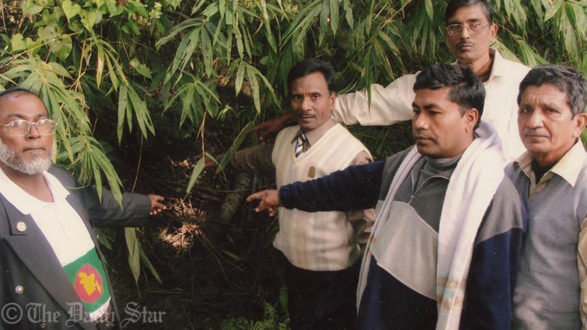 Locals point at Batajore mass killing ground in Gournadi upazila of Barisal. Photo: Star