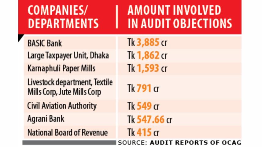 Besides, there are audit objections involving Tk 66.77 crore against Rajdhani Unnayan Kartripakkha, Tk 63.92 crore against Bangladesh Water Development Board, Tk 105 crore against 10 companies under the civil aviation and tourism, textiles and jute, food, health and family affairs and industries ministries, and Tk 63.66 crore against the health engineering department.