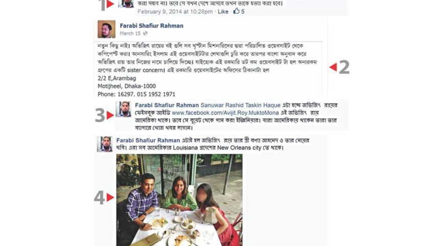 This is exactly what happened in the case of slain writer-blogger Avijit Roy. Farabi became a Facebook friend of Avijit about five years ago. Later, he started reading Avijit's blog, Mukto-Mona, and came to learn about his views on religion and science.