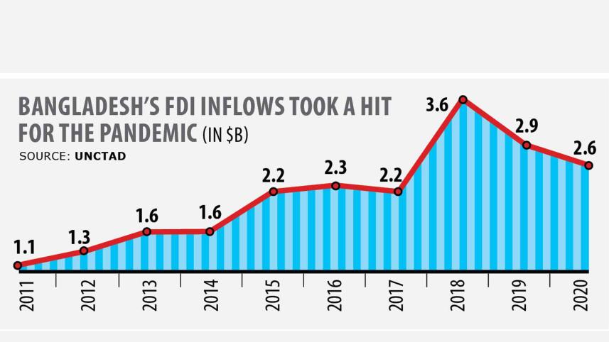 Bangladesh's historically low foreign direct investment, which had dropped 10.8 percent to $2.6 billion last year, is unlikely to pick up in the near future as investment commitments remain lukewarm, according to the UNCTAD.