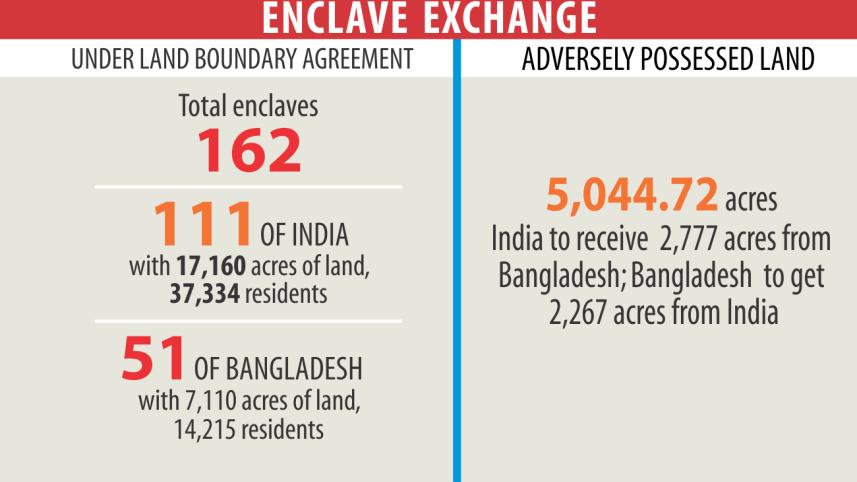 India will transfer 111 enclaves with 17,158 acres of land and a population of 37,369. The enclaves are spread across four districts in Bangladesh -- 12 in Kurigram, 59 in Lalmonirhat, four in Nilphamari and 36 in Panchagarh.