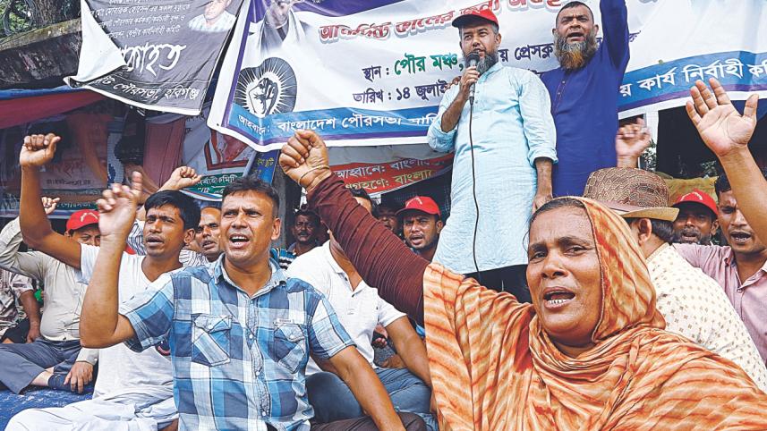 Since July 14, municipality employees have been staging an indefinite sit-in in front of the Jatiya Press Club, also demanding regular payment from state coffers.