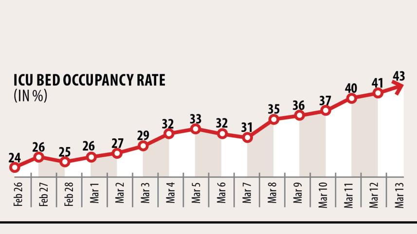 The percentage of occupied ICU beds jumped to 42.76 yesterday from 28.18 on February 13, according to surveillance data from the Directorate General of Health Services (DGHS).
