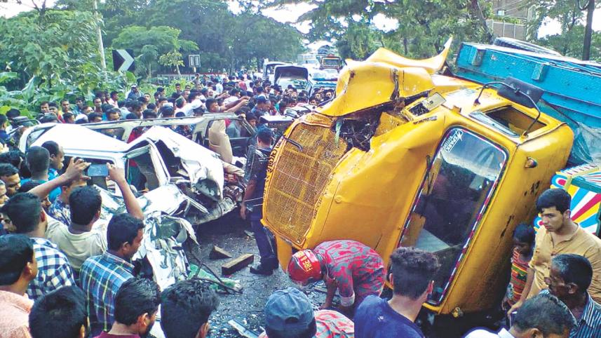 The deceased were identified as Salma Akhter Popi, 30, assistant teacher of Tarikata Government Primary School in Amtali, Sanu Mridha, 70, and Chan Mia, 48, both from Borobogi village, Rustam Ali, 36, of Chaula village, Abul Hossain Fakir, 65, of Botipara, four-month-old Oli Ullah and driver of the three-wheeler Abu Hanif, 45.