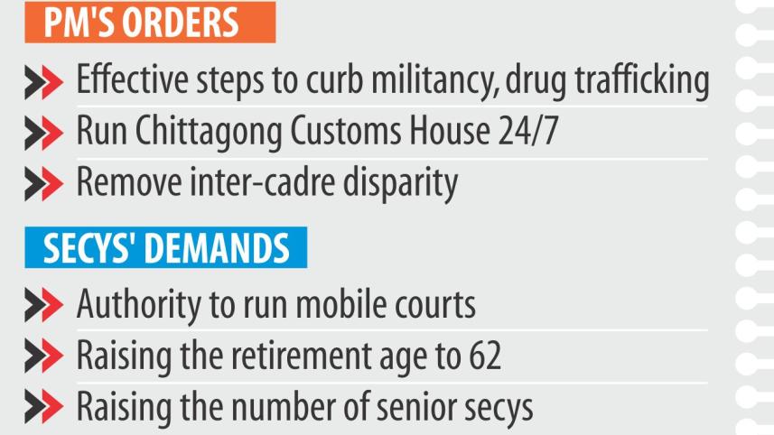 Addressing the meeting held at the Cabinet Division, PM Sheikh Hasina issued a 17-point directive to the top bureaucrats. These include taking effective steps at the field level to contain militancy and drug peddling, removing inter-cadre disparities and strengthening efforts to establish good governance.