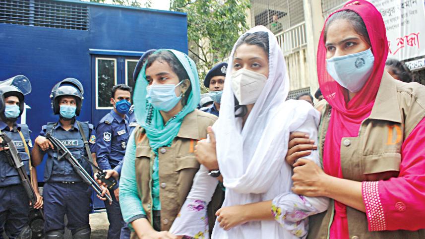 Minni, who was in the custody of her lawyer Mahbubul Bari Aslam, was brought to the court around 9:00am yesterday by her father on a motorcycle. Eight other accused, who were in jail, were taken to the court around noon.