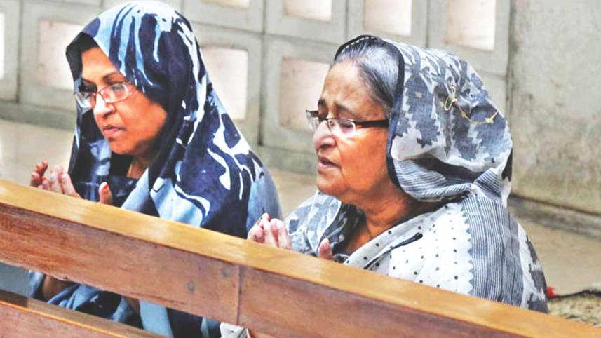 Prime Minister Sheikh Hasina and her sister Sheikh Rehana stood in solemn silence in front of the Tungipara tomb of the Father of the Nation on the day their family was massacred 40 years ago.