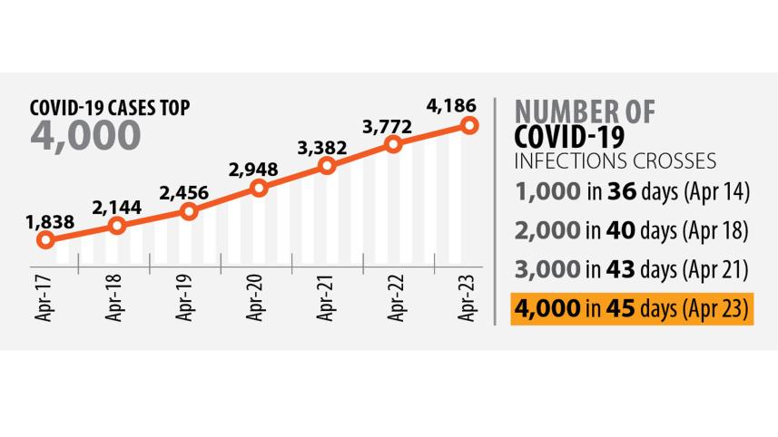 Prof Dr Nasima Sultana, additional director at the Directorate General of Health Services, said from March 23 to April 23, the number of cases has risen from six to 4,186.