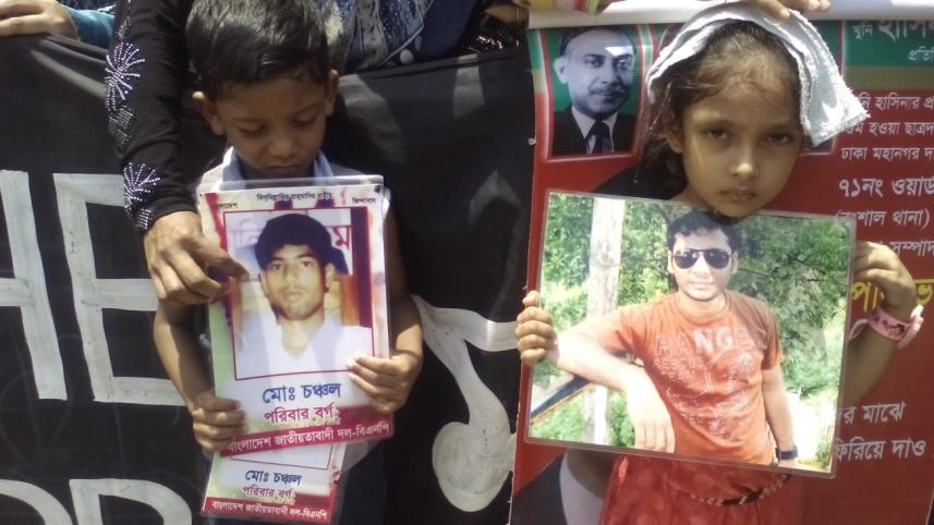 Mayer Dak, an organisation of 19 such families, yesterday formed a human chain under the banner “Mayer Dak” in front of the Jatiya Press Club in the capital, seeking the prime minister's intervention to get back their loved ones before Ramadan. Many children of the people who had disappeared joined the human chain braving the scorching heat.
