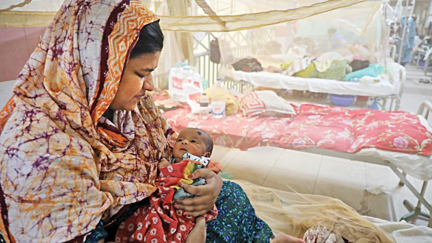 Rumana holds her five-day-old son in her arms while sitting inside a mosquito net at Mugda Medical College and Hospital yesterday. She was admitted to the hospital with dengue fever on October 20, where she gave birth to the baby boy through a C-section on Wednesday while fighting the viral disease. While the baby is in good health, the mother is yet to fully recover. Photo: Palash Khan