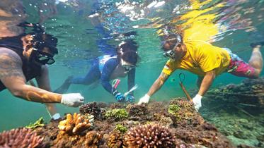 Using a snorkel and protective gloves, Pariama Hutasoit dives down into the clear waters off the Indonesian island of Bali to pull away plastic from a “reef star” installed by her conservation group to encourage new coral growth.