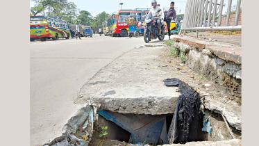 The roundabout at Muktijoddha Chattar on Sylhet-Dhaka highway in Sherpur Bazar of Moulvibazar Sadar upazila has turned hazardous to unsuspecting moving traffic.