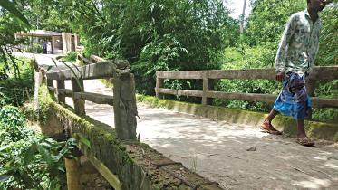 People in Alisarkul area of Srimangal upazila in the district are suffering a lot as a bridge on a canal on the local road has been lying broken for the over eight years.