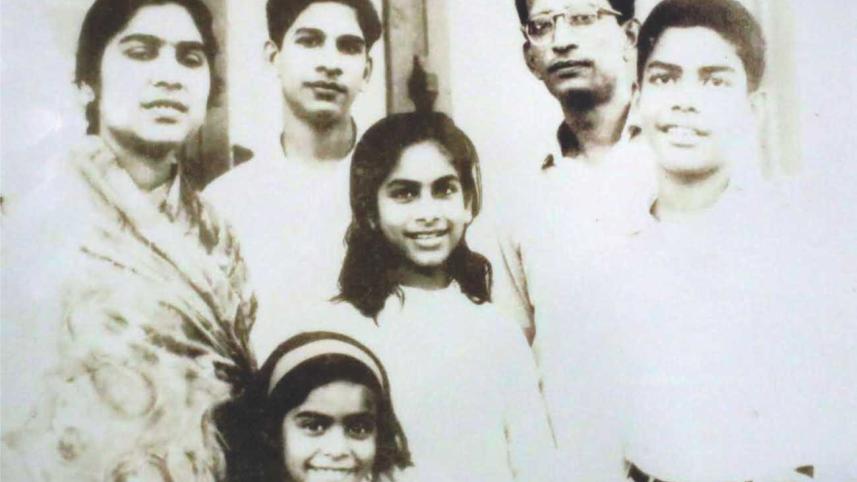 This is a family picture in black and white. My father, mother, two brothers, my youngest sister and me. We are standing in front of the newly built house in Dhanmondi. We had dressed specially for the occasion. We used to oil our hair at that time. My oiled hair appears to me to be wet. There is a reason for this.