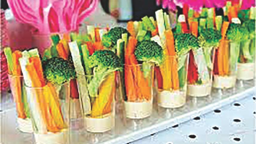 Assorted fresh vegetables: bell pepper strips, broccoli florets, baby carrots, cucumber slices.