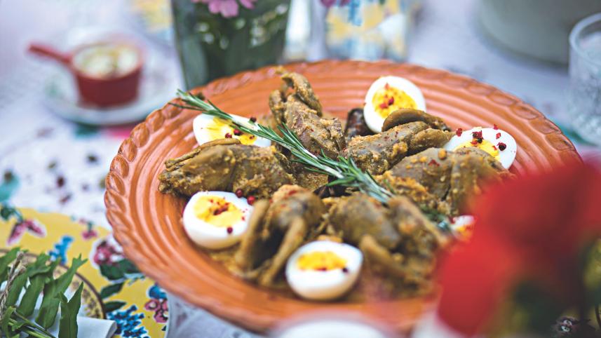 Keep stirring till browned. Add the duck pieces and salt. Squeeze in half a lime and mix well. Add little water, lower heat to medium and simmer till tender. Add green chillies. Cook for another 2 minutes. Remove from heat and serve.