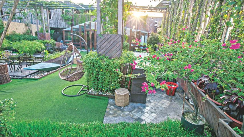 On that note, The Green Lounge has seven different sections, designed to give you a unique memory to take with you. The Park Harbour at the entrance of the rooftop is meant to make you forget that you are on the 18th floor, and instead, makes you feel like you're near a waterfall with the fountain running through the middle. The Chilly Tale is the garden patio that covers the perimeters of the entire restaurant. It can accommodate up to 100 green loungers. In fact, it is reputed to be the best seat in the house, as it oversees the city. You can even catch the sunset from Chilly Tale. Lime Land is curtained by rich green plants and a fun fact about the Lime Land is that it is the only spot in the building that will give you an uninterrupted view of the Ramna Park. The Gozari Valley is set apart from the rest of the dining sections with an over-hanging balcony with walls made of actual Gozari wood. The Water-Lux provides a luxury setting for special occasions like exclusive corporate meetings and also intimate family gatherings, and it can hold a capacity of 24 guests. While the Chilly Tale is the best seat in the house for its amazing view, the Sky Deck can give you a more intimate experience as it hides away from the rest of the sections. And lastly, if you want a combined experience of indoors and outdoors, there is the Telescope section with a moon roof, a wonderful way to experience the rain.