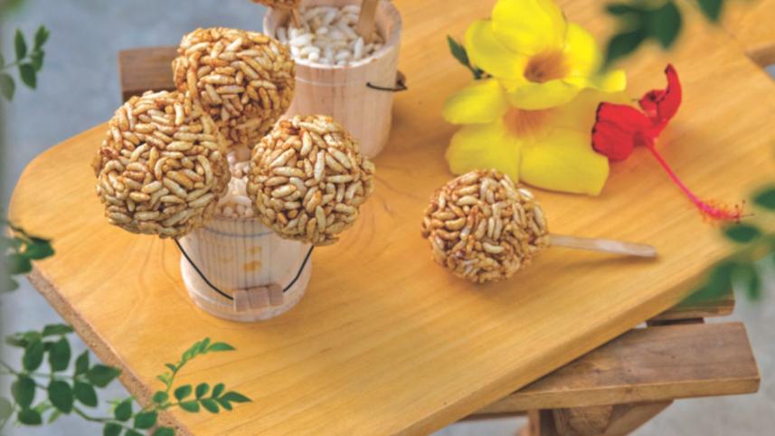 Dry roast the puffed rice in a cast iron skillet for about a minute. Take them out form the skillet and keep aside. Place jaggery and water in a pan, and dissolve the jaggery over low heat. Once the jaggery dissolves, increase the heat and bring it to boil and cook over full flame till a two-thread consistency is reached. Mix in the puffed rice quickly into the mixture. Take it off the heat and let it cool for a while. Make round balls by moistening the hands if the mixture is too sticky. Leave it to cool and serve.