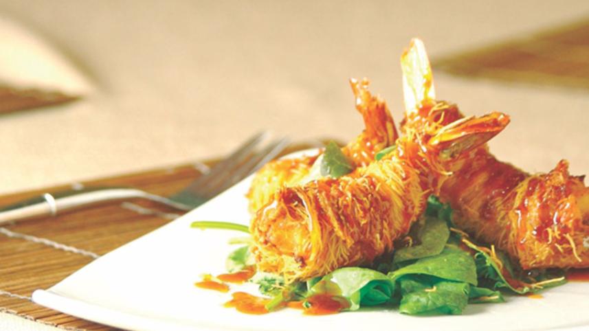 Marinate the shrimps in lemon juice, red chilli, salt, pepper, coriander, onion and garlic. Let it marinate for a couple of minutes. In the meanwhile make the sauce. Mix all the sauce ingredients. Dip the boiled noodles into the sauces. Pierce the shrimps with the satay sticks through the back of its tail. Wrap these with the noodle strands. Heat oil in a pan, deep fry them until brown.