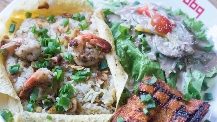 Their Gochujang Chicken with Shrimp Fried Rice is a generous platter. The garlic rice, topped with large sized shrimps, comes on a 'bowl' of omelette: the rice is not stuffed inside, rather, the omelette is shaped like a dish, so as to serve the rice.