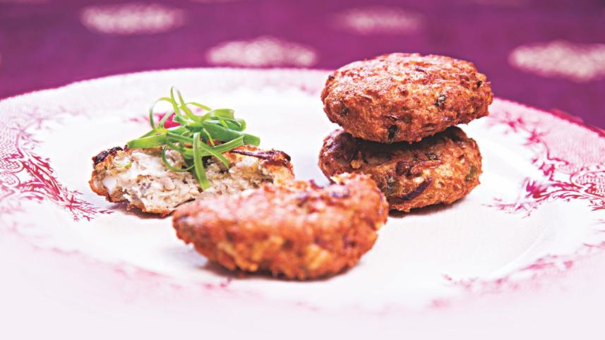 Pick the blood vessel and soak in cold water for 1 hour. Change the water a few times. When it is properly soaked, the water will remain clean. Blanch in boiling water for two minutes and remove onto a rack to thoroughly drain. Take the bread slices and dip them in water for one minute. Now squeeze gently. Mix all ingredients except the flour and oil. Now make a cutlet from the brain mixture with your hand. Coat in flour and leave for half an hour. Heat oil in a pan. Fry the cutlets until brown. Serve hot.