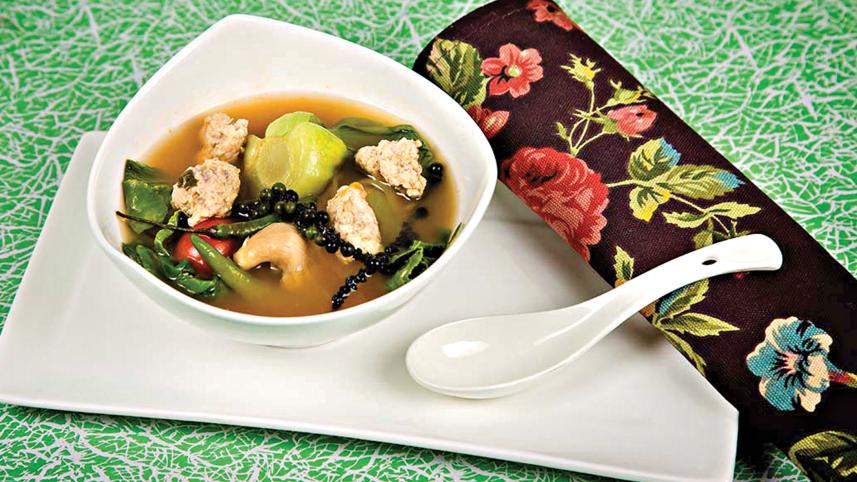 In a bowl, combine all the ingredients from the chicken marinade and mix well. Make chicken mix into small balls using ½ tablespoon of the mixture. Wash and cut the bok choy in ½ inches lengthwise. Add the chicken stock in a soup pot on high heat. Let it boil. Add the chicken balls into the boiling stock. Simmer for 5 minutes. When the chicken balls are cooked add bok choy, soya sauce, mushrooms, green chili and peppercorn stem, simmer for 2 minutes, adjust the taste. Remove from the heat. Serve hot.