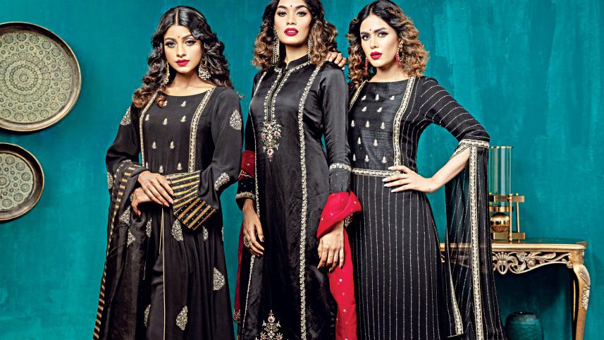 Their women's white handloom collection, black premium raw-silk collection and muslin line-up are nothing short of radiating elegance and the aura of royalty for Eid to come. They also alternate and have created a wide variety of kameez's with zardosi work in palettes of pastels. Their core fabrics for Eid being premium raw-silk, Muslin, and handloom cotton.