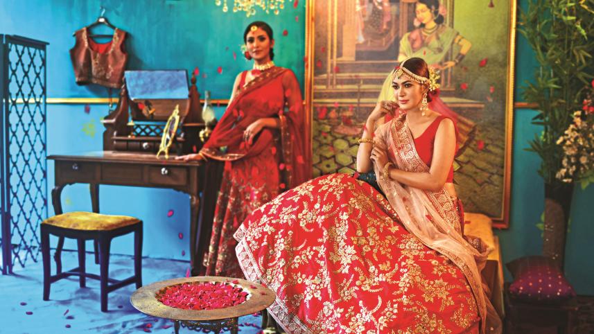 To keep the bridal look elegant and royal, the designs come in pure raw silk with delicate zardosi and zari thread work, sequins and pearls, and a variety of pastel shades, such as baby pink. Other than that, for those looking for the classic yet charismatic bold red outfit, designer lehengas decorated with glamorous patterns and in extravagant designs are also available — everything to release that inner queen!