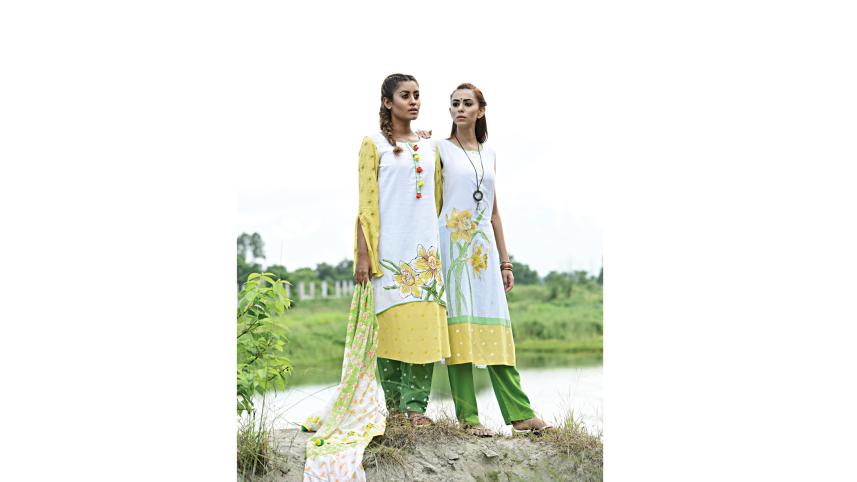 A hypnotising aura of rains, blooming flowers and the occasional breeze is the core of monsoon. The culmination of all these mesmerising elements of the season is the highlight of Kay Kraft's latest line-up. The fashion house has included sari, shalwar kameez, kurti, tops, panjabis and shirts in their latest collection celebrating all that is monsoon. Screen print, digital print, machine embroidery and hand embroidery have been used extensively to bring out the seasonal blossoms adorning the clothes. Kay Kraft is all about a touch of tradition matched with modern cuts this season.