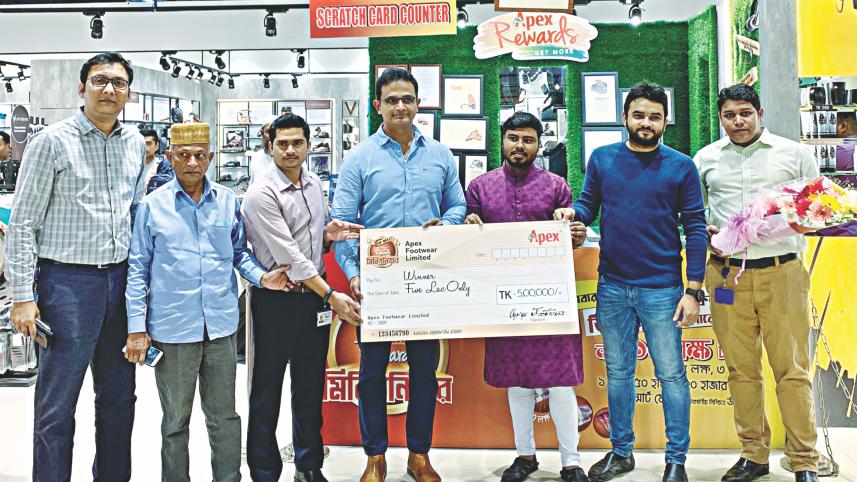 In the quest to find new shoes this wedding season, Shibli Rahman Pavel from Cumilla won Tk 5 lakh from Apex in their 'Ke Hobe Apex Rewards Millionaire' campaign. Apex's CEO, Rajan Pillai, handed the cheque to him at the capital's Jamuna Future Park. Before him, Shahjahan Sujon, from Dhaka, won Tk 1 lakh.