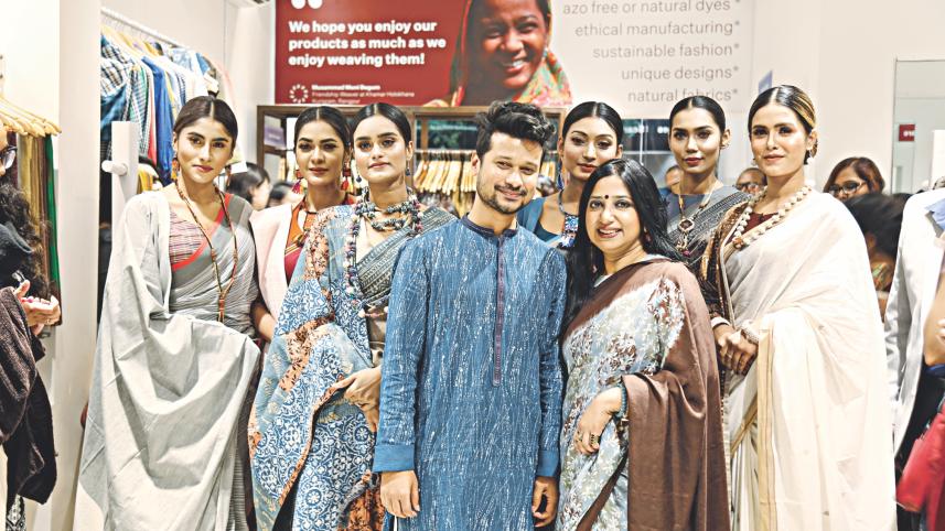 The fashion show included a brand collection by Friendship's designer Imam Hassan, followed by novelty draperies designed exclusively for Friendship by renowned designers like Maheen Khan, Kuhu Plamondon and Chandana Dewan. The final queue was dedicated to specialty natural dyed Jamdani saris, designed by prodigious fashion guru, Chandra Shekhar Shaha.