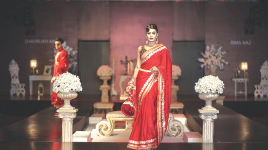 Rima Naz's collection was inspired by the rich culture and heritage of Bangladesh, where she put in her own little touches of modern designs. The collection sported myriad pastel tones; florals stood out throughout the collection, and came in many forms of roses, lotuses and daisies. The designs were flowy and accentuated by lots of pleats, frills, feathers, with the flared blouses and capes being a definite standout.