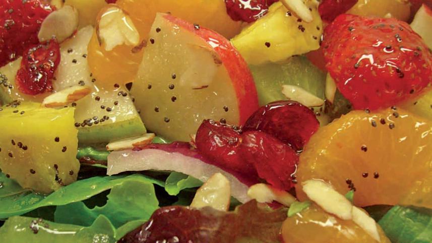 Wash and cut all the fruits. In a bowl mix together all the ingredients gently. Cover and refrigerate for 3-4 hours. Garnish with the mint leaves and serve.