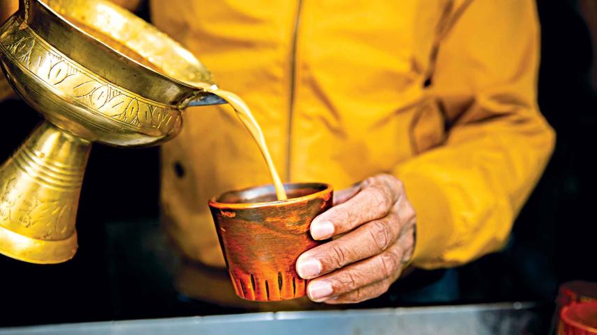 This tea shop in old Dhaka has its own rustic charm; soot laden kettles of tea and milk are being steamed at high heat; a regular buzz of customers has kept the servers on their toes. Everyone is peeping at the big stove where the terracotta cups are kept warm, and ordering for this new fancy tea.