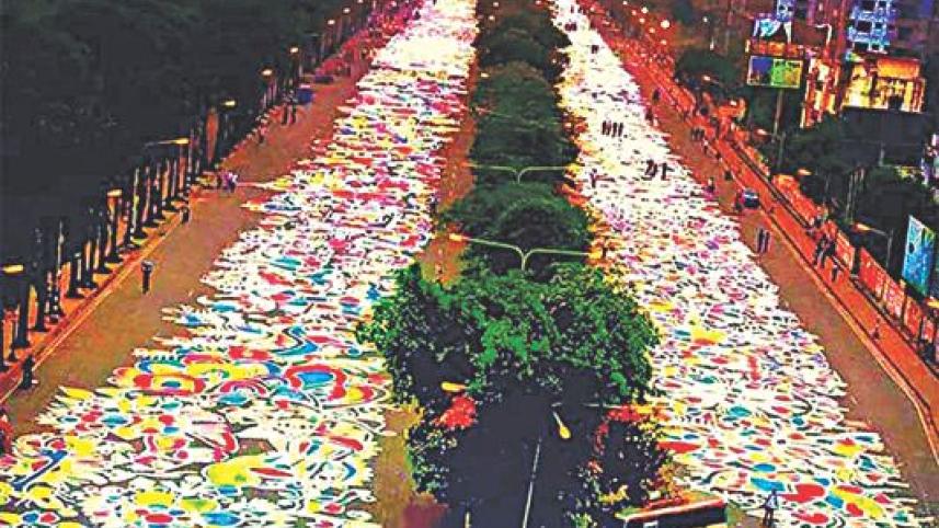 Here, I cannot help recalling one of my personal experiences. Due to its extensive international media coverage, this event got itself into the limelight for many non-native viewers. A certain juvenile friend of mine from Calgary, who hardly knew anything about Bangladesh or its cultural context, expressed his wonder at this "colossal" of a "street-graffiti" attempt. He asked whether or not these hand-painted motifs are subjected to "criminal" liability since expressing your ideas freely in a creative fashion, like any other open-street initiative, can be, at times, "risky." I laughed at that moment and tried to explain the situation. But now that I think of the homologous words, "motifs" and "motives," the close connection between Pahela Baishakh and breaking the chains to attain one's creative freedom becomes apparent again. Behind the alpana patterns, likewise, lies the same inspiration, where in order to celebrate the new, you have to bring out the "new" within as well, each stroke of your paint-brush giving birth to a new hope.