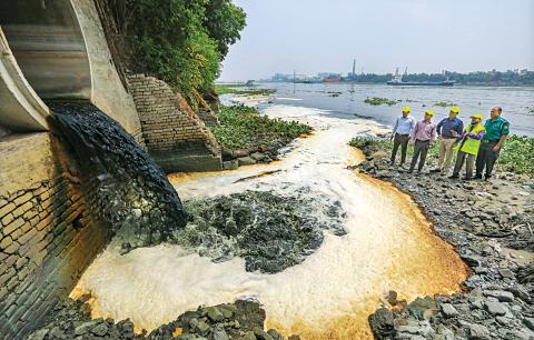 A team from the Department of Environment inspects a site where untreated industrial waste is being discharged into the Buriganga river. They later took a water sample from the site. The photo was taken yesterday at Doleshwar Ghat in Dhaka’s Shyampur. Photo: Amran Hossain