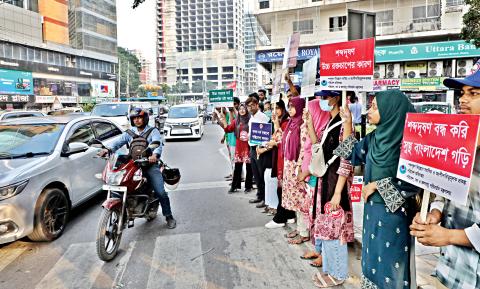 Volunteers hold up signs saying “Honking not allowed” and “Please don’t honk” while vehicles wait at the Gulshan-2 intersection. Under a new initiative from the environment ministry, volunteers from several green organisations are raising awareness at traffic signals in various area of the capital. The aim is to reduce noise pollution by informing drivers that unnecessary use of horns is not allowed. The photo was taken yesterday. Photo: Prabir Das