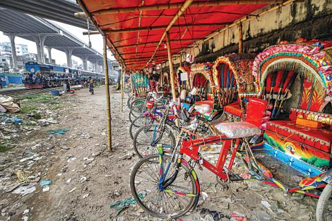 Battery-run rickshaws stand parked under a makeshift shed on railway land in the capital’s Tejkunipara, where exposed illegal electric lines are used for charging, posing grave safety risks. PHOTO: RASHED SHUMON