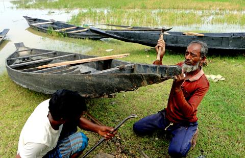 Fishermen in Sylhet repair their boats on the bank of a pond. With the arrival of the monsoon, these boats will become a key instrument in their fishing ventures. The photo was taken from the Baishtila area of Sadar upazila yesterday. Photo: Sheikh Nasir
