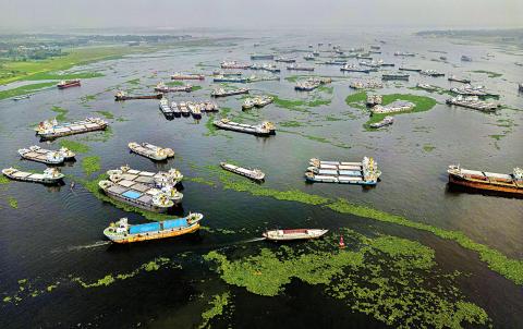 Bulk carriers are anchored in the middle of the Dhaleshwari river, obstructing other vessels. The vessels are anchored there for weeks on end, as the designated place for mooring nearby has space constraints and requires fees. Boats from Dhaka and the surrounding districts rely on this crucial riverway for transportation. The photo was taken in Muktarpur of Munshiganj. Photo: Rashed Shumon