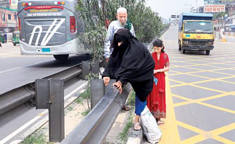 A woman tries to step over the divider on a highway to get to the other side while her family members wait beside her. This dangerous act could lead to an accident at any moment. The photo was taken from the Dhaka-Mawa Expressway yesterday. Photo: Amran Hossain