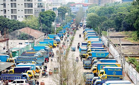 Illegally parked trucks line both sides of the Mayor Annisul Huq Road (Tejgaon-Satrasta) all throughout the day, significantly narrowing the width of the road and contributing to congestion. The photo was taken yesterday.