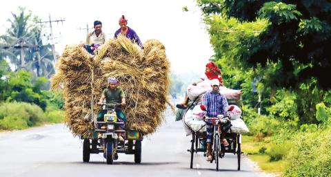 Traders transporting massive loads of paddy straw on a Nosimon, a locally made vehicle that should be off the highway, while an overloaded rickshaw van carries sacks of farm produce. Such blatant disregard for road safety often leads to crashes. The photo was taken on Khulna-Satkhira highway. Photo: Habibur Rahman