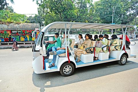 Dhaka University yesterday introduced electric shuttle cars as a means for students to get around the campus more conveniently. Under an initiative supported by the Green Future Foundation, four “Campus Shuttles” will operate daily from 8:00am to 8:00pm. Fares will be between Tk 10 and Tk 20, depending on the route. Each vehicle can accommodate around a dozen people. The photo was taken yesterday at TSC. Photo: Firoz Ahmed