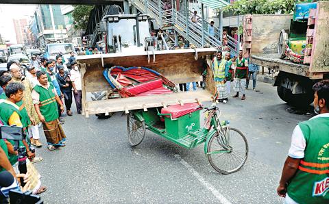 A bulldozer crushes and carries away a battery-run autorickshaw as part of Dhaka North City Corporation’s drive to remove such vehicles from major streets in an effort to reduce traffic congestion and improve road safety in the capital. More than 100 illegal auto-rickshaws were seized during yesterday’s drive between Dhanmondi-27 intersection and Asad Gate. Photo: Palash Khan