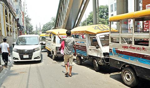 Human hauliers, locally known as legunas, are parked occupying along a stretch of Indira Road in the capital’s Farmgate area, causing inconvenience to pedestrians and disrupting vehicular movement. The photo was taken around 11:30am yesterday. Photo: Prabir Das