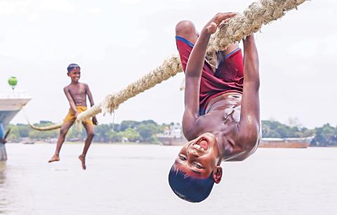 Children swing from the mooring line of a ship on the Bhairab river in Khulna, seeking a bit of fun and relief from the scorching heat after school.