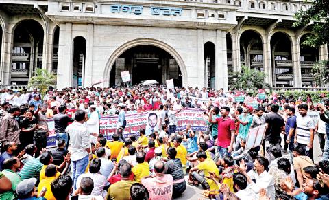 Supporters of BNP leader Ishraque Hossain demonstrating outside Dhaka South City Corporation headquarters yesterday afternoon, demanding that he be sworn in and given the responsibilities of the city mayor following a court order.